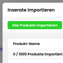 Klicke in der Übersicht nun auf "Inserate importieren", jetzt lädt sich eine Vorschau-Liste deiner zu importieren Produkte.Klicke auf "Alle Produkte importieren" um den Import zu starten.